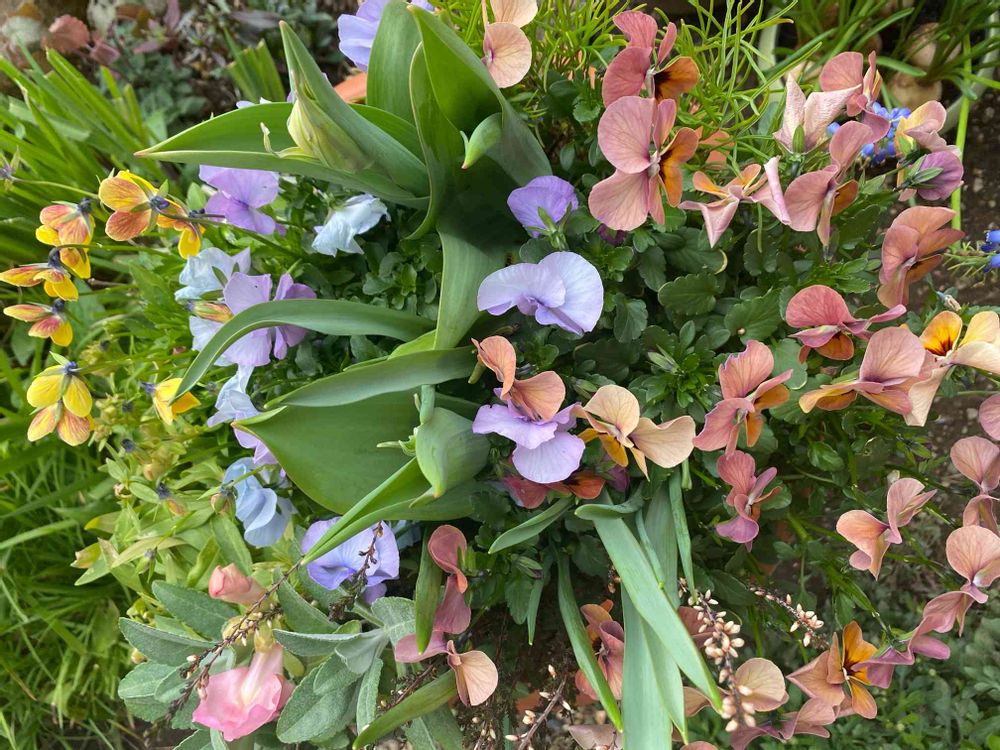ビオラの寄せ植えの下に球根も盛り込みました💐