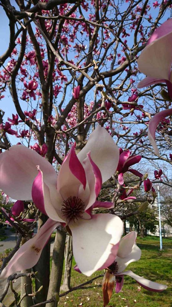 紫木蓮と白木蓮の交配種なので花が大きいです。紫木蓮は花がもう少し小さくて、花びらが全開しないで咲きますよ〜😉