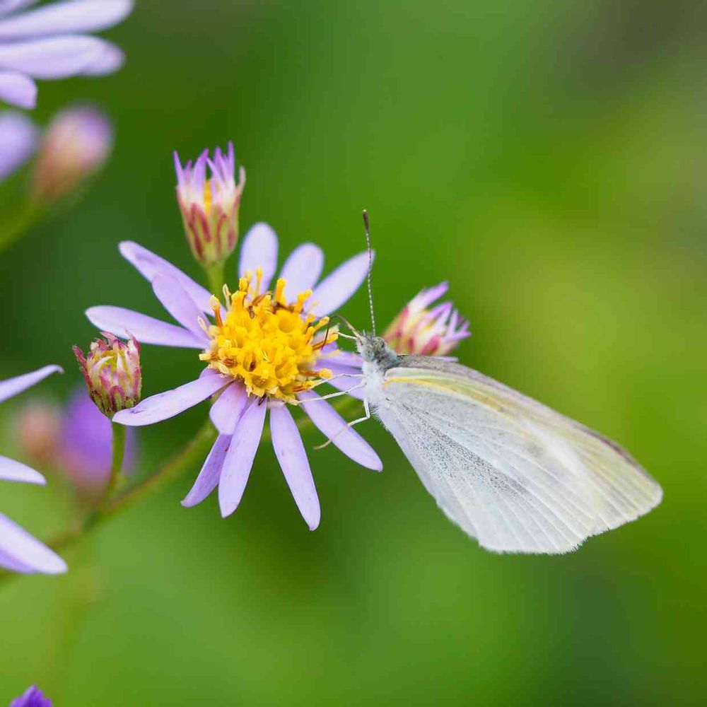 キレイ✨モンシロチョウの目もステキやけど、シオンの蕾の萼の縁が赤く染まってるところにドキドキ💓