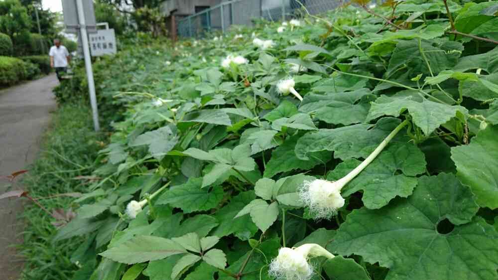 ある日遊歩道でカラスウリの花をみつけた‼ 秋になるのが楽しみだったのに、次の週刈り込まれてたよ〰⤵がっかり。