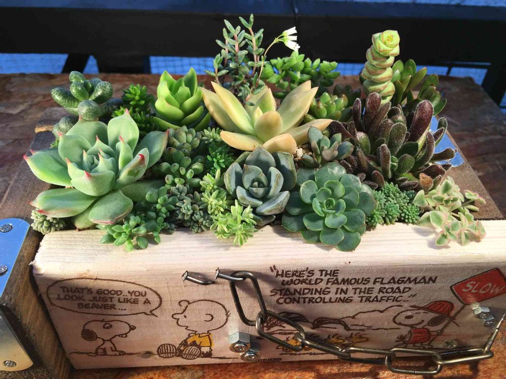 kaoriちゃんのガッチリ金具とスヌーピーの可愛さが木箱に凝縮(☆︎∀︎☆︎)ニヤリ 今日はベランダ行ったり来たりして寄せ植えしながら多肉狩りです💖