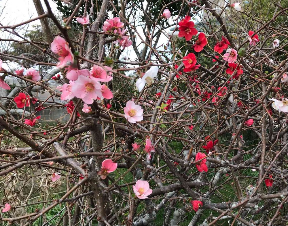 お散歩の途中、幼馴染のお母さん宅のボケの花。2色づかいで可愛い💕