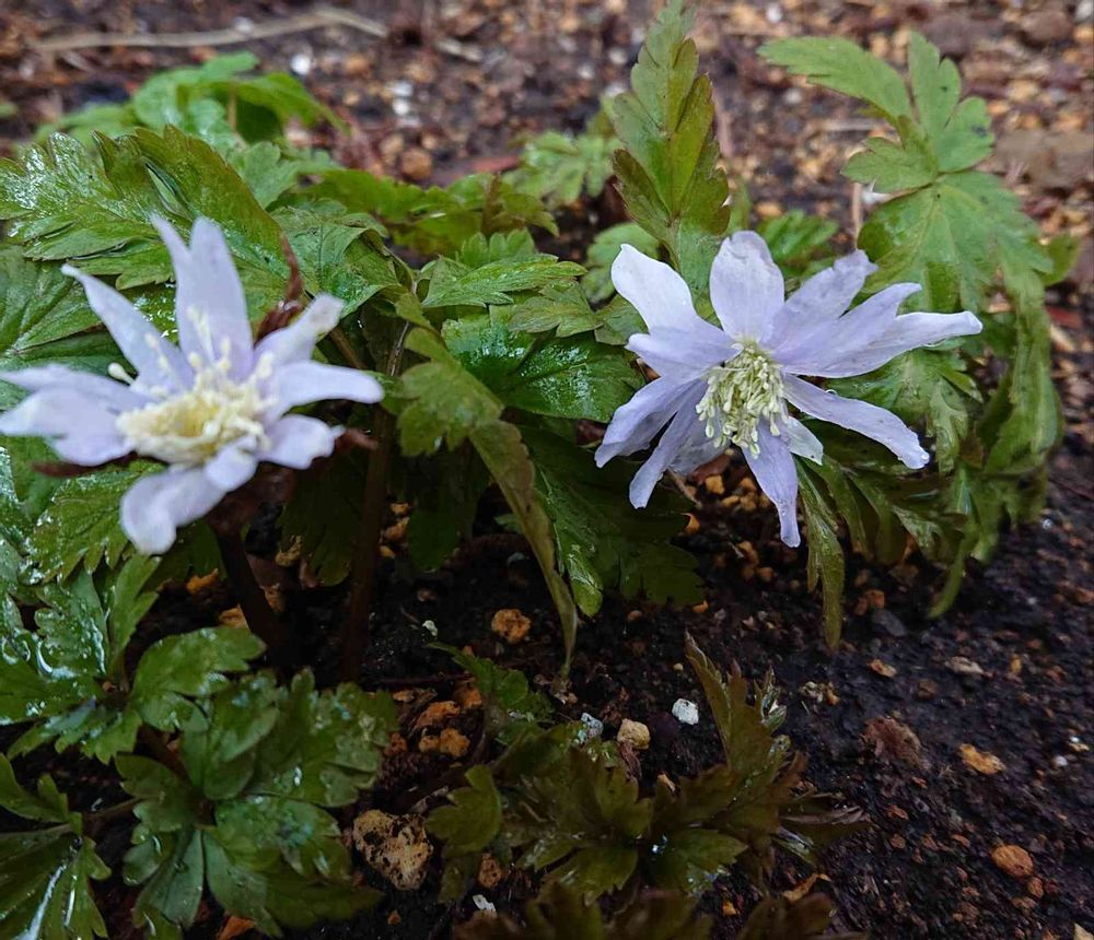 仕上げに水やりしてたらキクザキイチゲの花を発見❕🎵 松の下にもぐり込んで撮りました😂