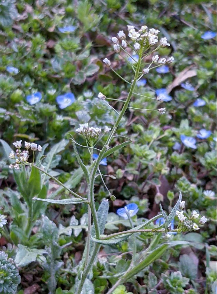 ナズナ、子供の頃からお馴染みのペンペン草。オオイヌノフグリの中あちこちに、いつの間にかナズナが伸びています。