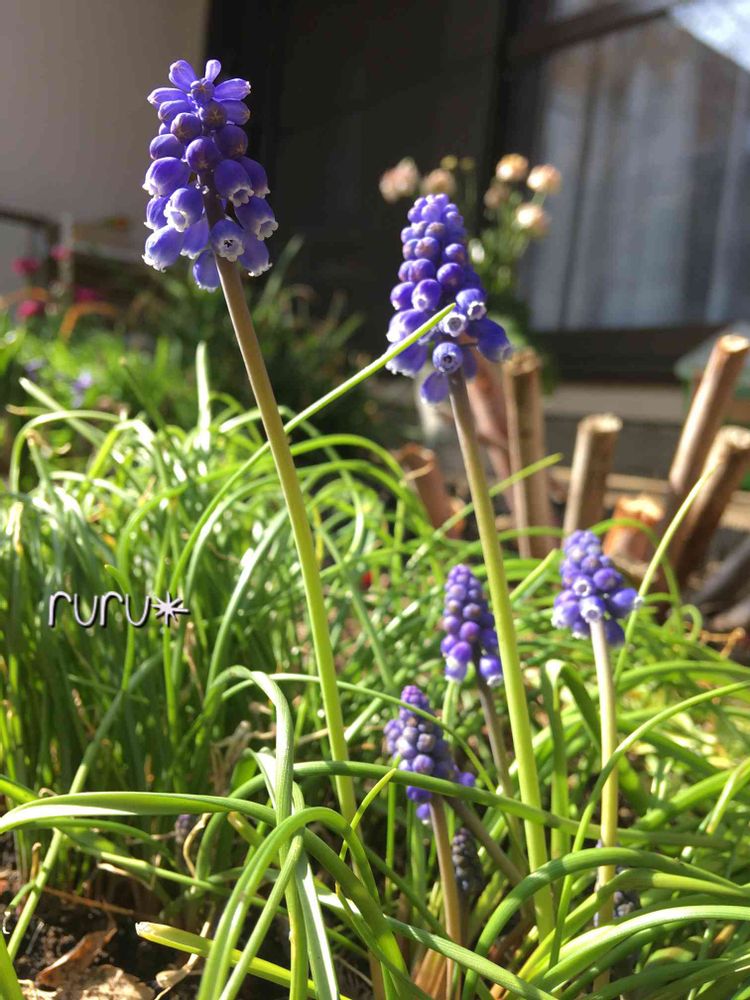 ムスカリ父さん、ムスカリ母さん、ムスカリお子達、、、ムスカリ一家が風になびいてます〜可愛い😊