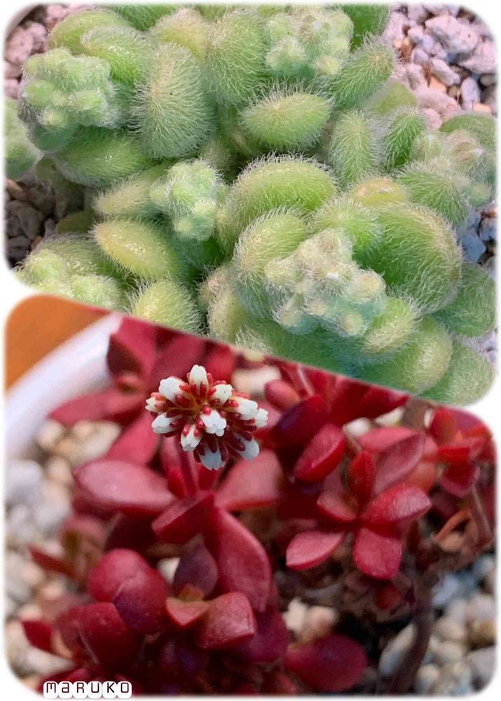 カシミアヒントニーから花芽らしきモケモケ👀 と⬇️真っ赤な(元斑入りw)紅稚児にたった2つの花芽💕 両方とも葉の中心部分から出てるみたいです😳