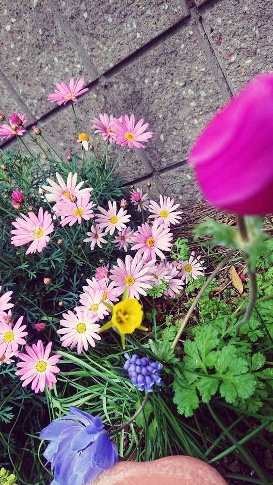 黄色い花が!!ムスカリとあねもねの間から顔を、出しました🌸植えた覚えの無いお花どこから来たんだろぅ?めっちゃ賑やかに、なった💕来てくれてありがとう💕🌸