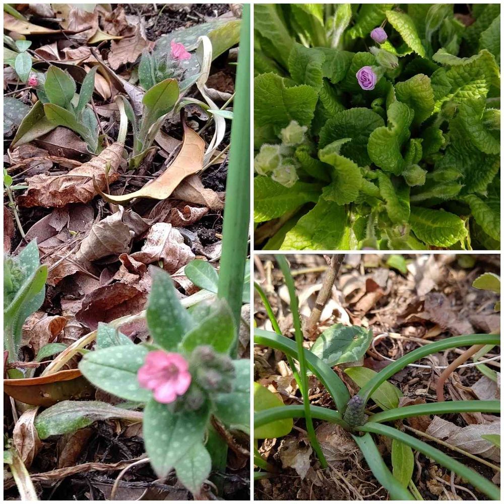プルモナリア、ダブルプリムローズ、ムスカリ