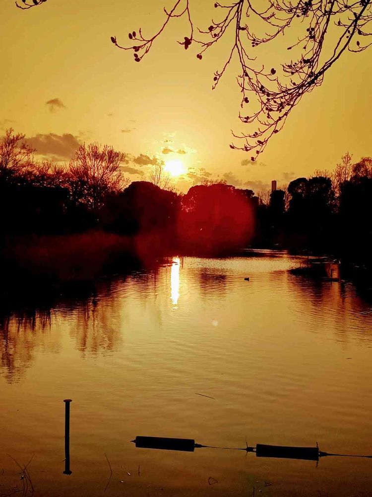 買い物帰りに、水元公園の水辺の夕焼けです。