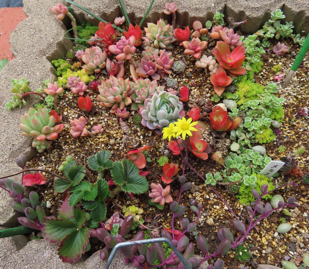 氷点下5℃の寒さや霜柱にも負けないで,厳しい冬を無事に乗り切った地植えコーナーの多肉たち。いつの間にかルビーネックレスの花も咲いていた。