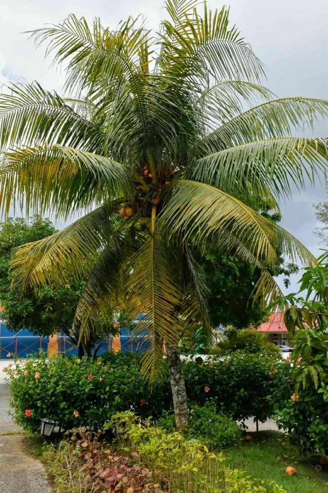 先日拾ったゴールデンココナッツ。親の木はこれでした。ここから落ちて駐車場まで転がって来たみたい。また落ちてる〜、と思って拾ったらすでにナイフで切って中身が飲まれた後だった。
