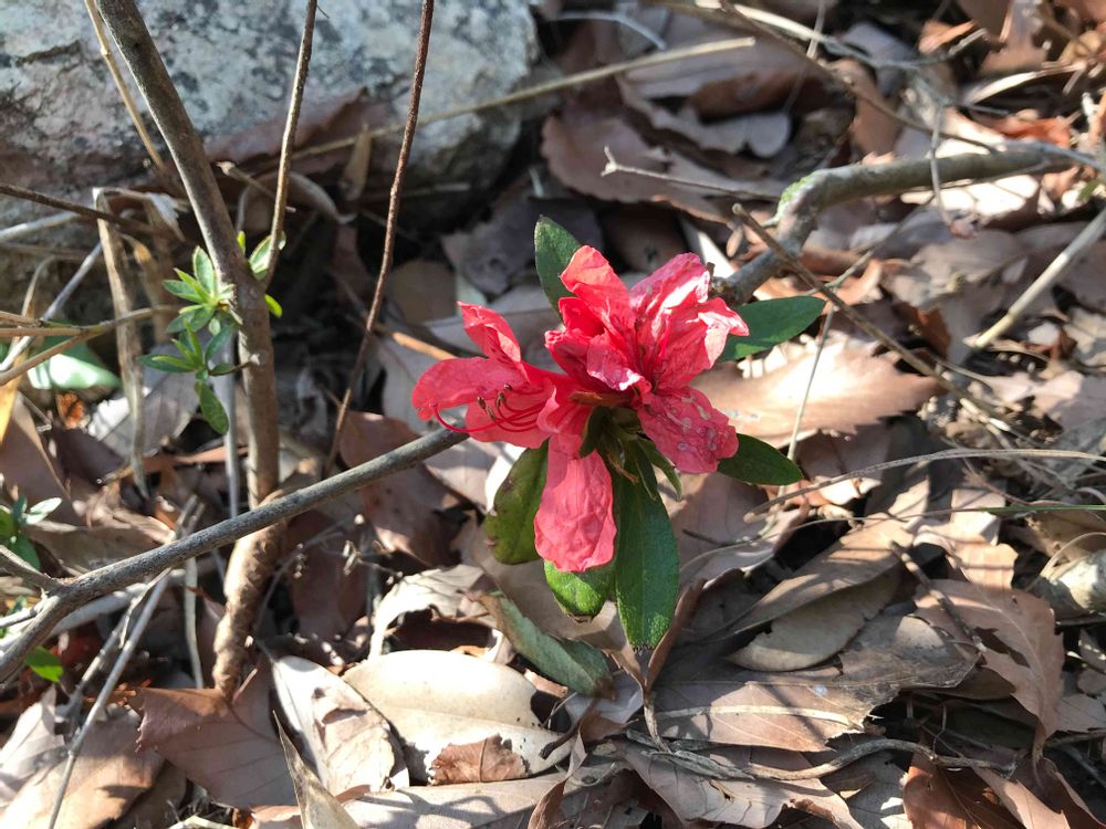 プチ登山で見つけました🥾まだ色味の少ない山で、綺麗な朱色が目立っていました🧡低い木の枝からポツポツと咲いている感じでしたが、ツツジでしょうか…?