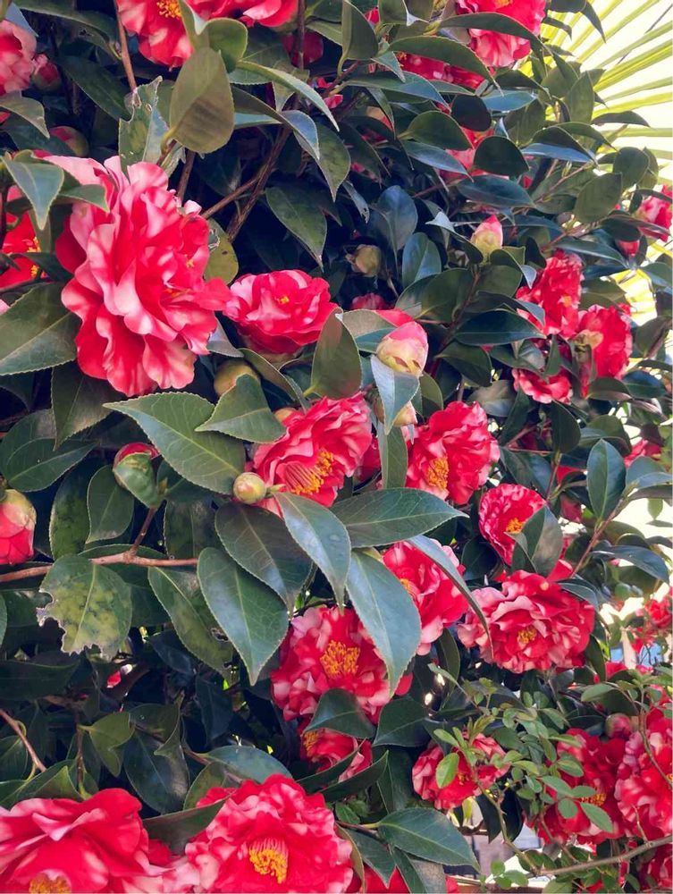 ご近所に生えている椿は見上げるくらい大きいのですが、そこにびっしりお花が咲いておりました!!