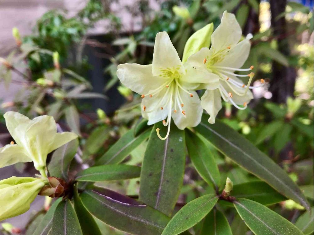 日陰つつじ 花は控えめな黄緑色。日陰で蛍光色のように発光して見えます。葉は肉厚でシャクナゲのようです。