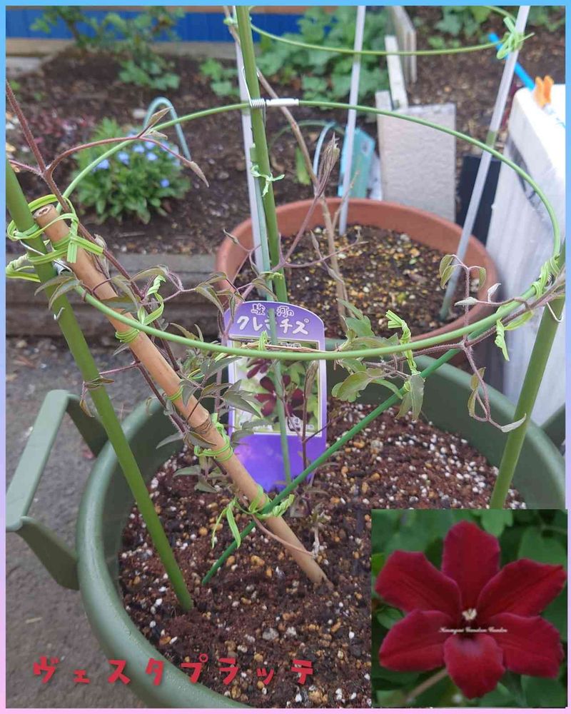 先日じいちゃんのお家🏠に養子縁組したクレマチスの【ヴェスタプラッテ】です✌️咲くと右👉下👇のように濃ゆ〜ぃ色のお花が咲く予定ですぞ🌸👏👏👏😘開花したら再度pic🆙するので覗いてちょ👀🙌