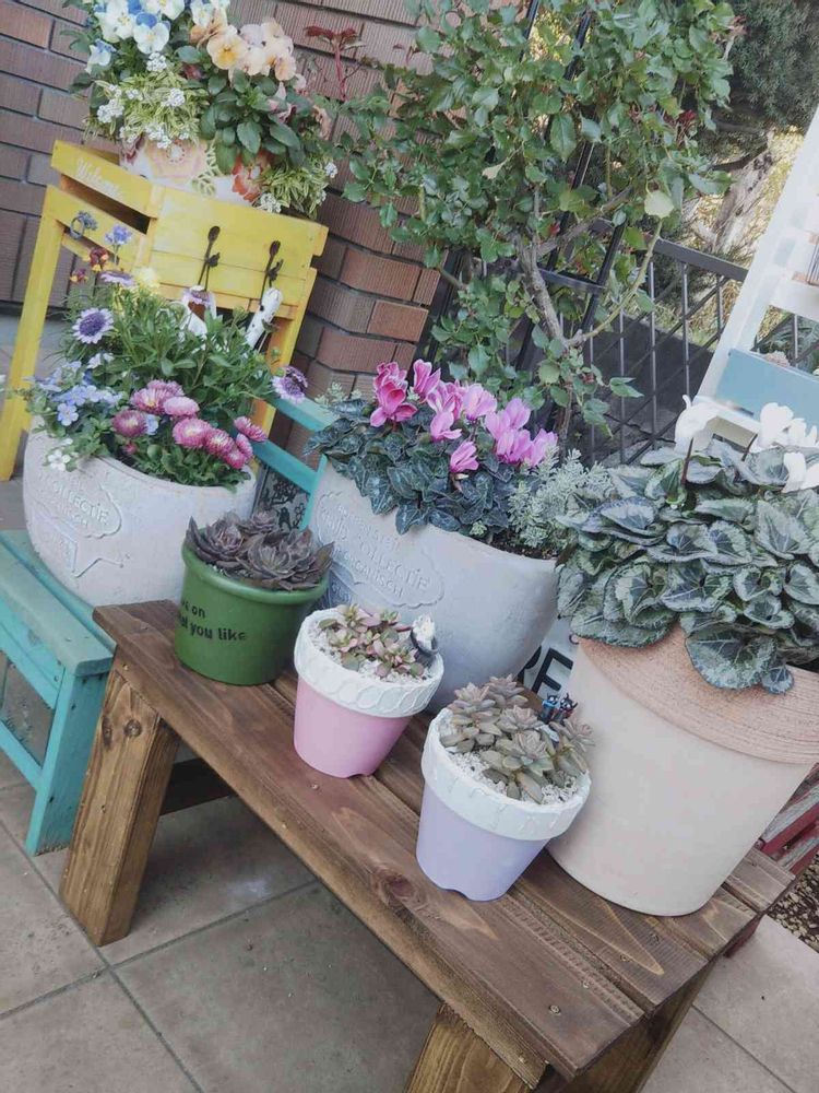 庭や家の中にDIYで作った物と一緒に多肉植物やバラ、寄せ植えをかざって、楽しんでます🌼