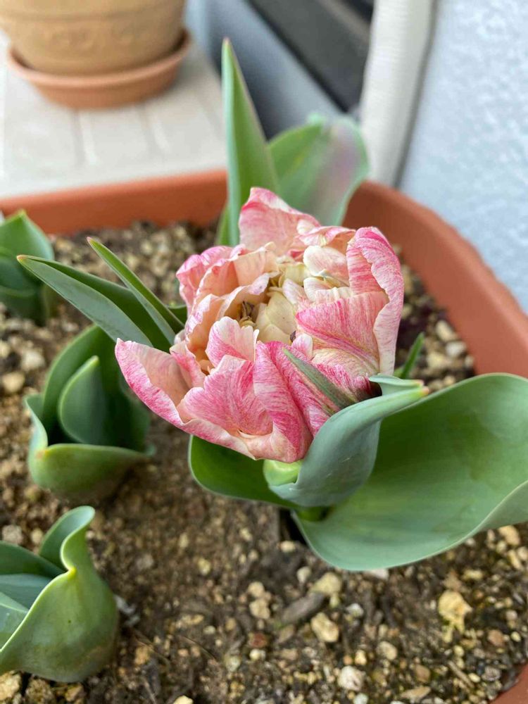 さん、超短いんですが…。初めてのチューリップ🌷これから伸びるんじゃないんですか〜😓まだ開きますかね?😅