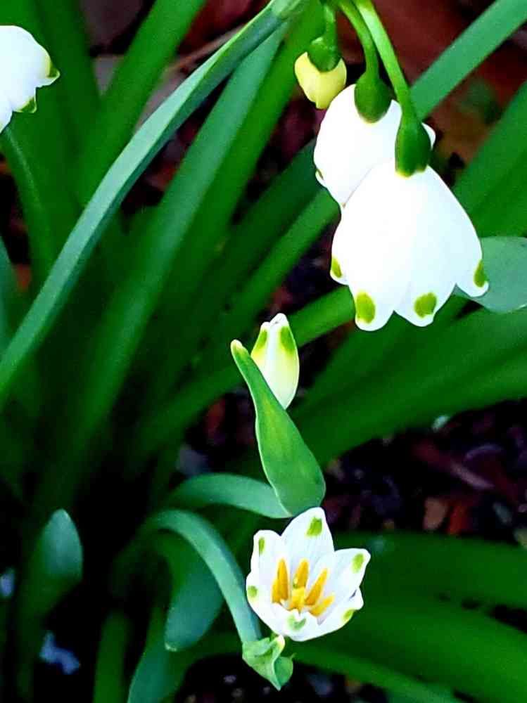 3月~5月頃開花し、鈴蘭に似た花で丸っこく、花びらの先はフリルのよう。釣鐘状の花がスズラン、細長い葉がスイセンのようだから鈴蘭水仙とも言われています。白い花弁の縁に緑の水玉模様があります。