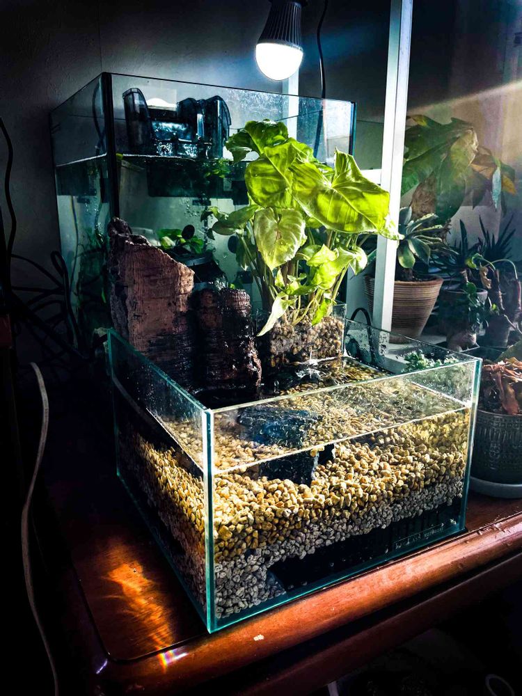 ダイソーに売ってたタオルバーに吊り下げる美容小物容器が、「えっ?これ、水槽栽培用プランターじゃないの?」って感じの構造だったので、見切り品のシンゴニウムと買って帰って実験的に水槽に設置してみました😊