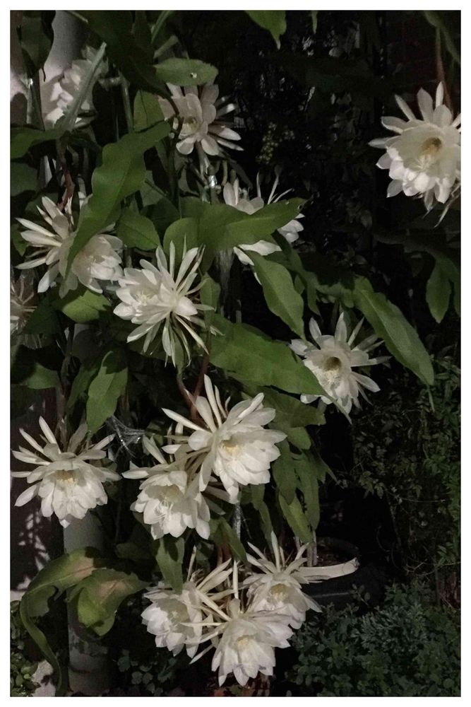 さん🌸我が家も紐で倒れないようにしてます😅火鉢の中に月下美人を、鉢ごと入れてるのですが上に上にと伸びるので倒れないようにするのが大変です😥とにかく上にも横にも暴れまくります(笑)だけど花が咲いたらぜーんぶ忘れて花姿や匂いにうっとりします(笑)マリリンさんが興奮する気持ち分かりますよ😊でも近くでそんなに沢山の花を見ることが出来るなんて何か良いことが有るのかもね💕💕💕