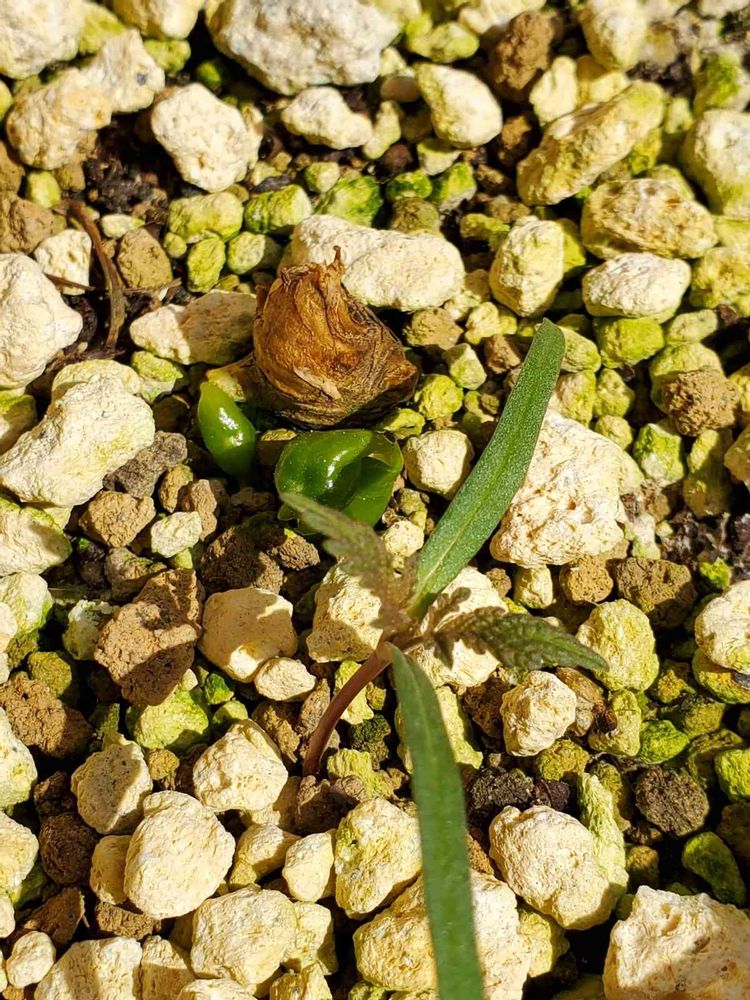 害虫にかじられたハッカクレンの親株の脇から、新芽が二つ!