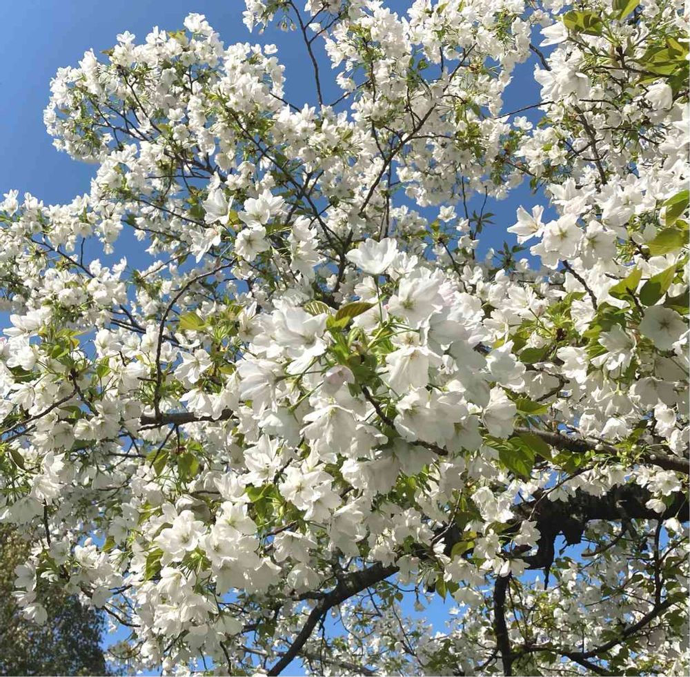 青空に少し若葉が入るオオシマザクラとっても素敵✨