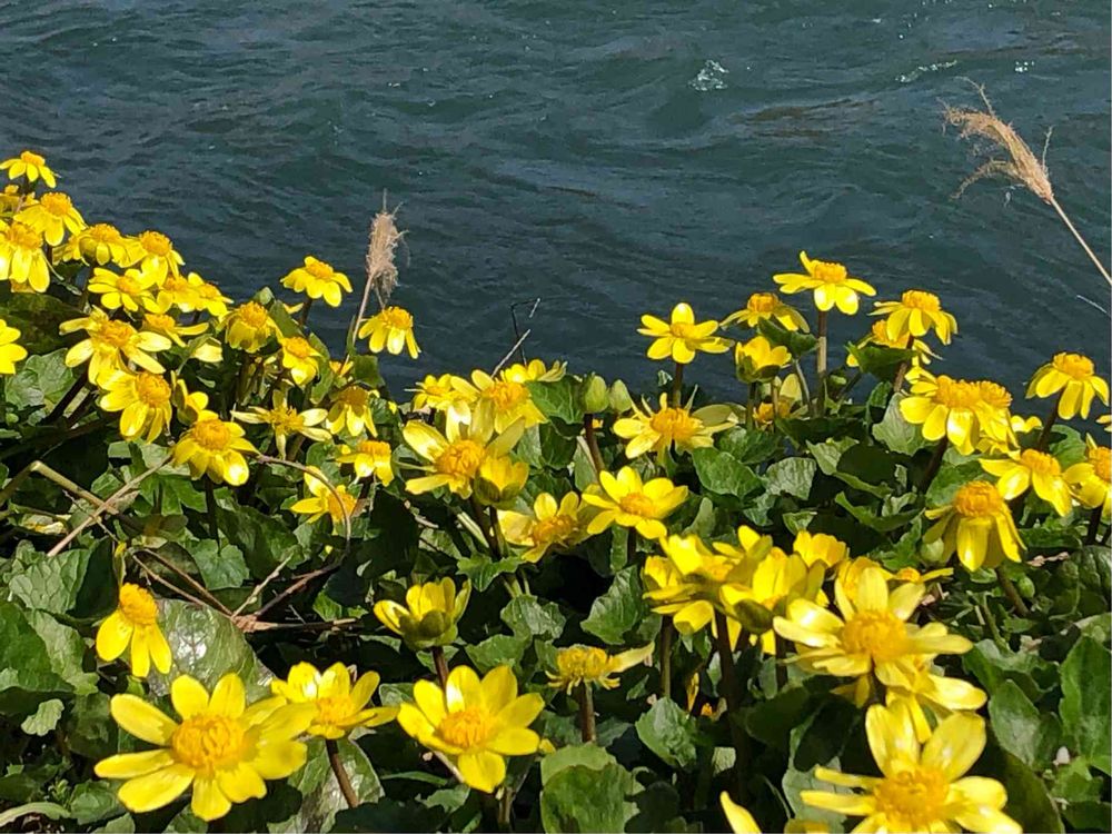 久しぶりに我が家の裏の土手を散歩しました。つくしは出てるだろうなって、歩いていると対岸に黄色のお花が群生してました。