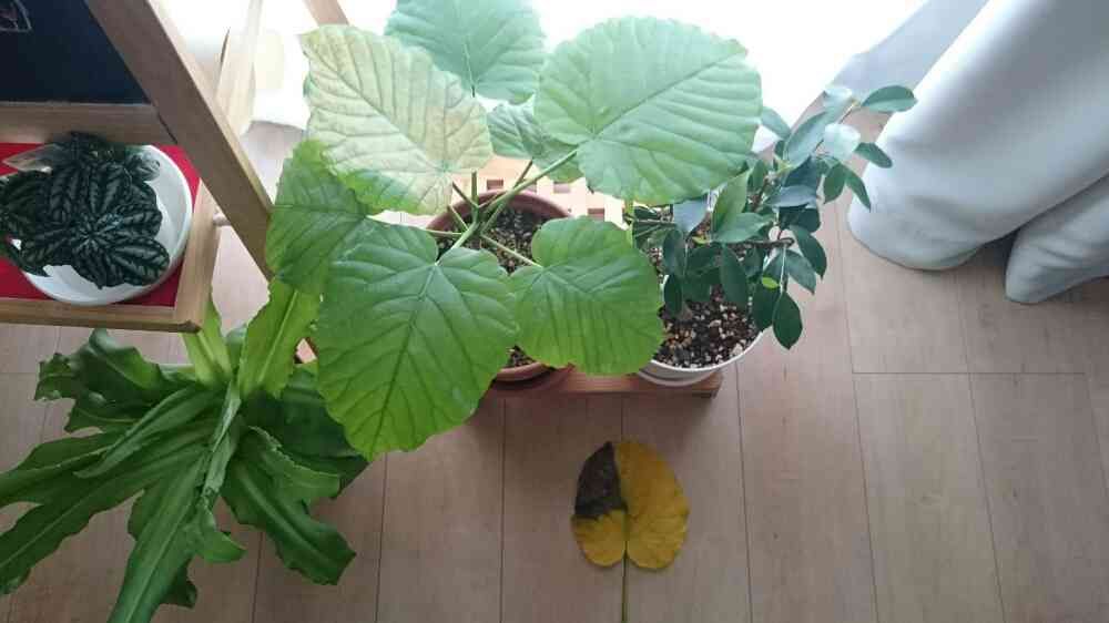葉やけ挿し木ウンベくん、初の落葉です✨子どもが、気になって息を吹き掛けたらポロっととれたって??((*´艸`))