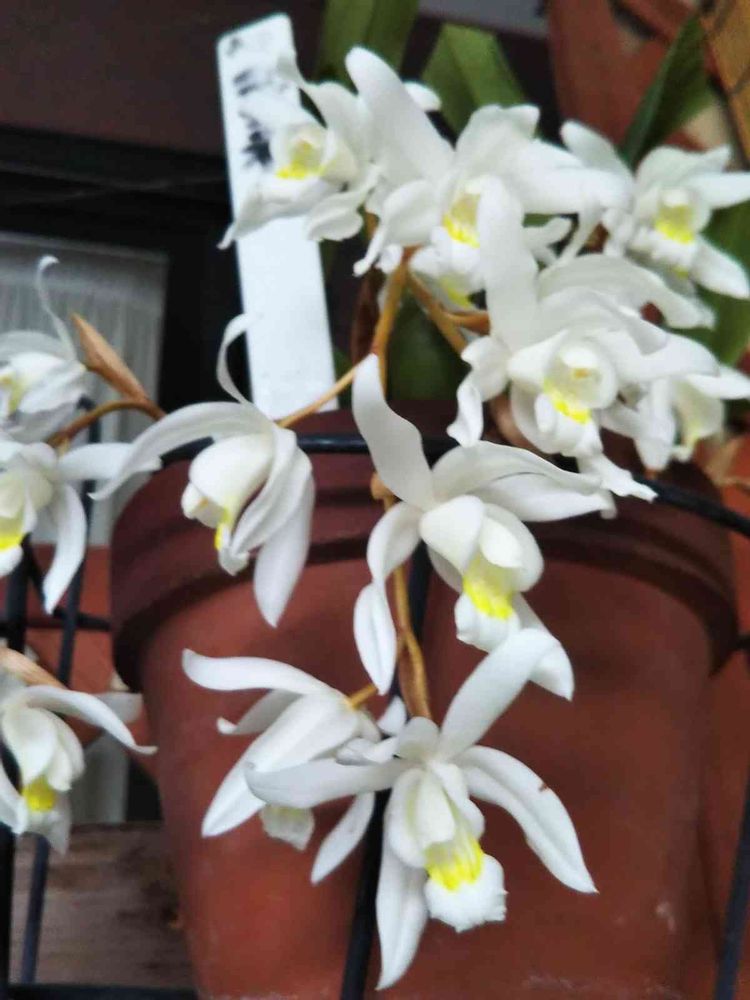セロジネ満開です、蘭系統は温度管理してれば(勝手に👴寒い玄関に置いてます 温度管理はしてない🙇)永〰️く花が持ってくれます。彼岸入り17日まで、隣村○渡 ぼた○屋さんで、数輪咲いた日から昨日まで呼び込み?店番してました。昨日キンギアナムと交換してきました。胡蝶蘭と流木デンドロビウムは飾ってます。今年は21輪全て咲いてます😉。