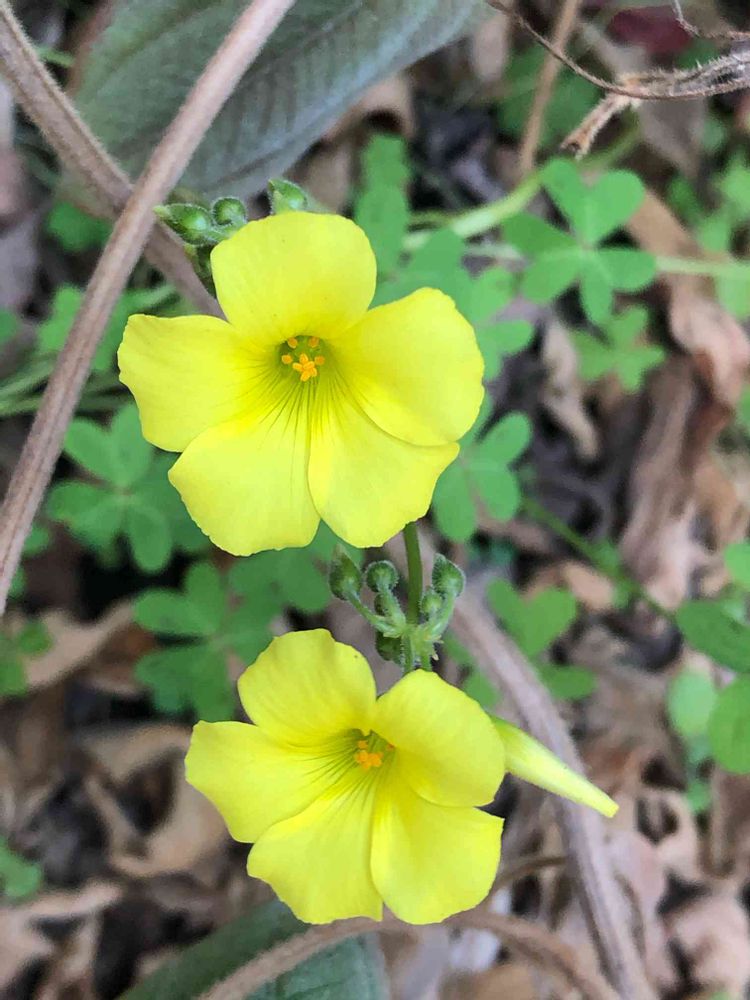 枯れたノボタンの陰に、可愛いカタバミを見つけました❗️