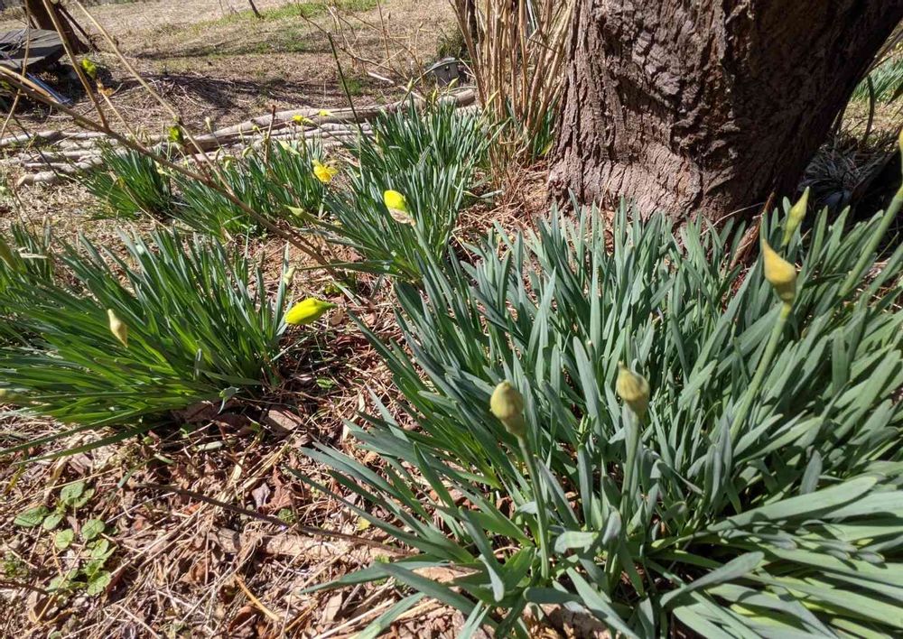 センダンの根元の八重の水仙、蕾がどんどん上がって、色付いて来ました。毎年庭のあちこちに増えています。