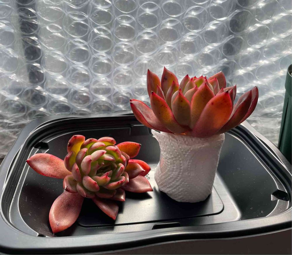 同じ株から分けた双子のレッドリリー、黒いプラケースに平置きとフェス巻き、どっちが早く発根するかを一人でプチ実験しています🔍(防寒のために巨大プチプチ