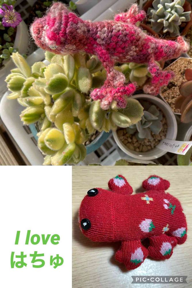 まつぴよさんのミニソクヤモリちゃん💕と、私が頑張って編み編みしたヤモリ🦎
