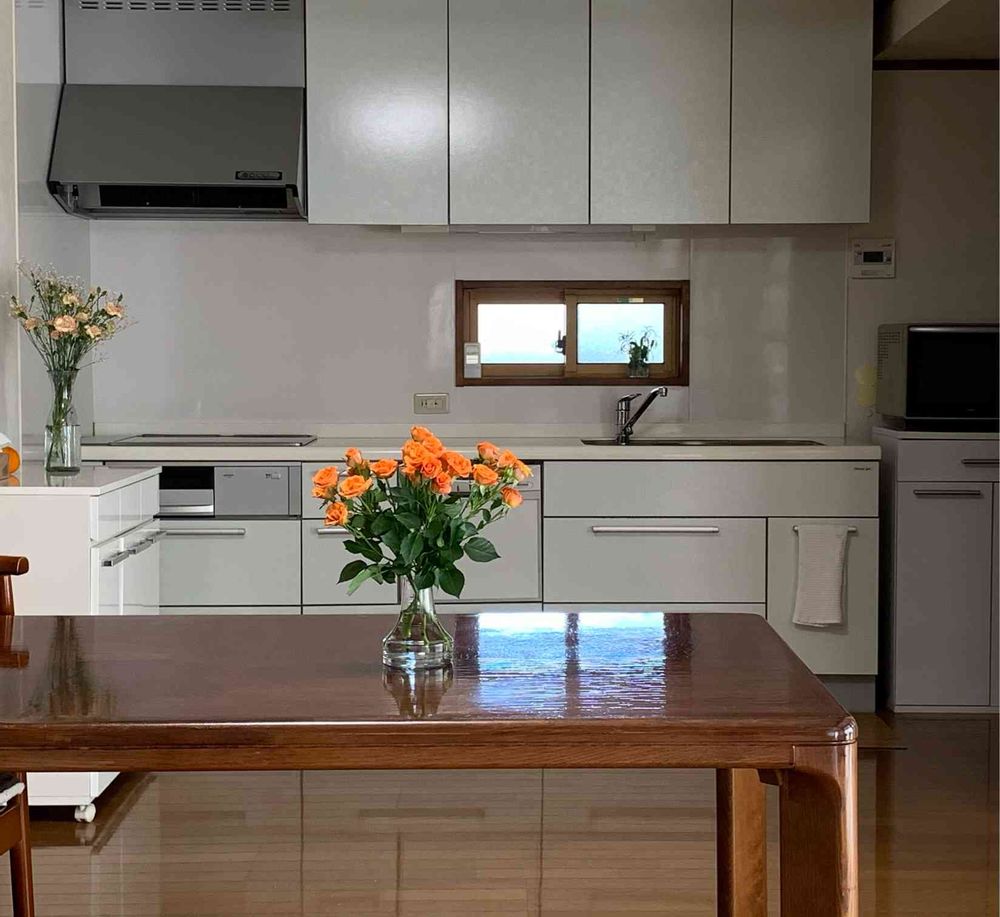 スッキリと 整然としたキッチンに お花のあるテーブル これだけで 食事も 気持ちよく 食べられますね🍀😌🍀