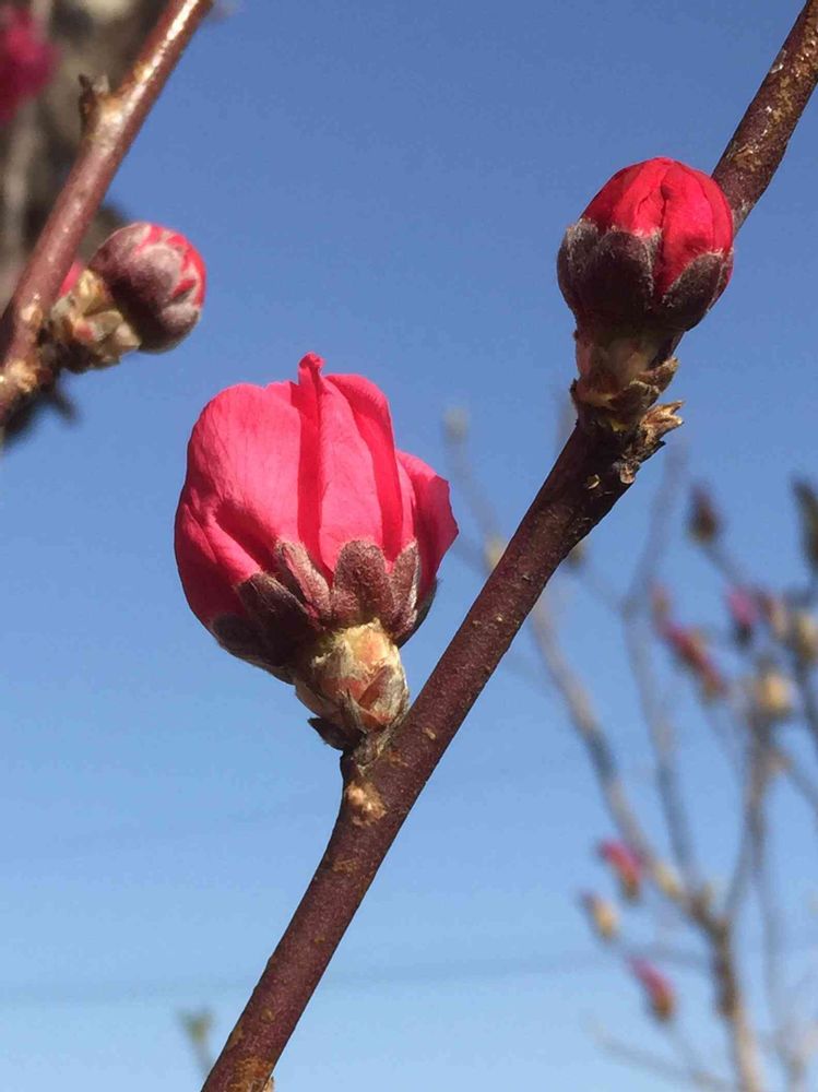 暖かさで一気に蕾が膨らみました!わが家の花桃は濃い赤?真紅?です🥰 yuyuさん主催の金曜日の蕾たちに参加させてください🙋♀️
