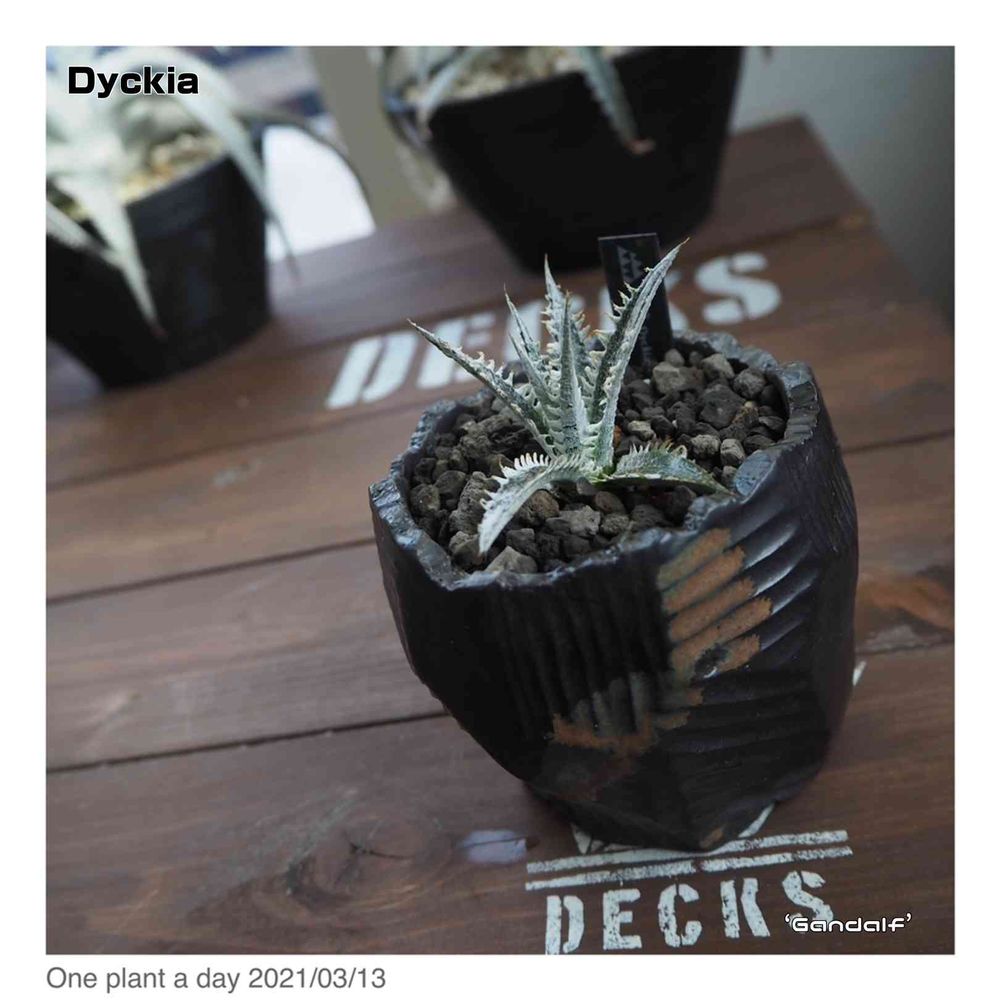 One plant a day. Dyckia ‘Gandalf’ BCR(14929) from @kimu7jp 昨年から予約していた株をお迎えしました😍まだ子株ですが、親株はワインレッドの葉に真っ白な大きな鋸歯から溢れるようなトリコームが展開するめっちゃかっこいい株です🤩何を植えようか迷っていた焼き立てホヤホヤの鉢にちょうど良いサイズだったので、期待を込めて植え替えました😉直径30cmに育つ大きなディッキアなので、秋には大きな鉢に植え替えになると思いますが、なかなかいい感じで収まりました☺️