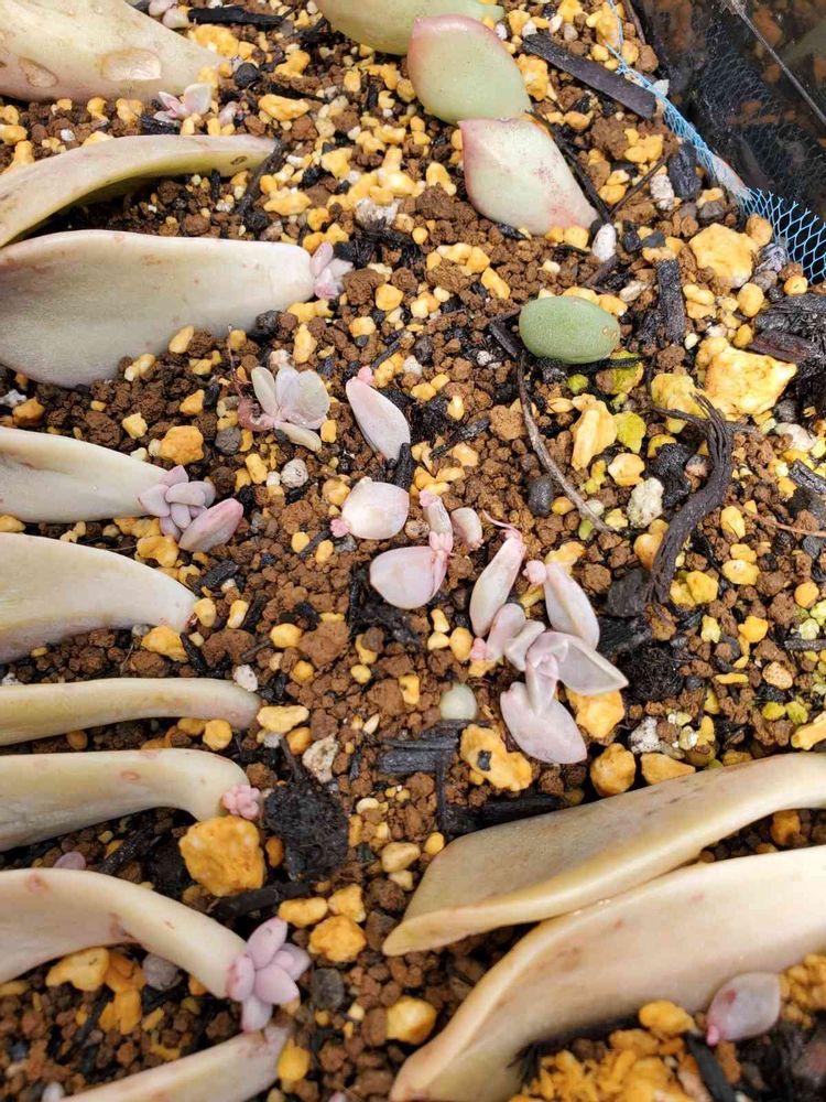 葉差しの親葉を、はずす時に失敗してバラバラになった葉っぱから小さな芽が‼️