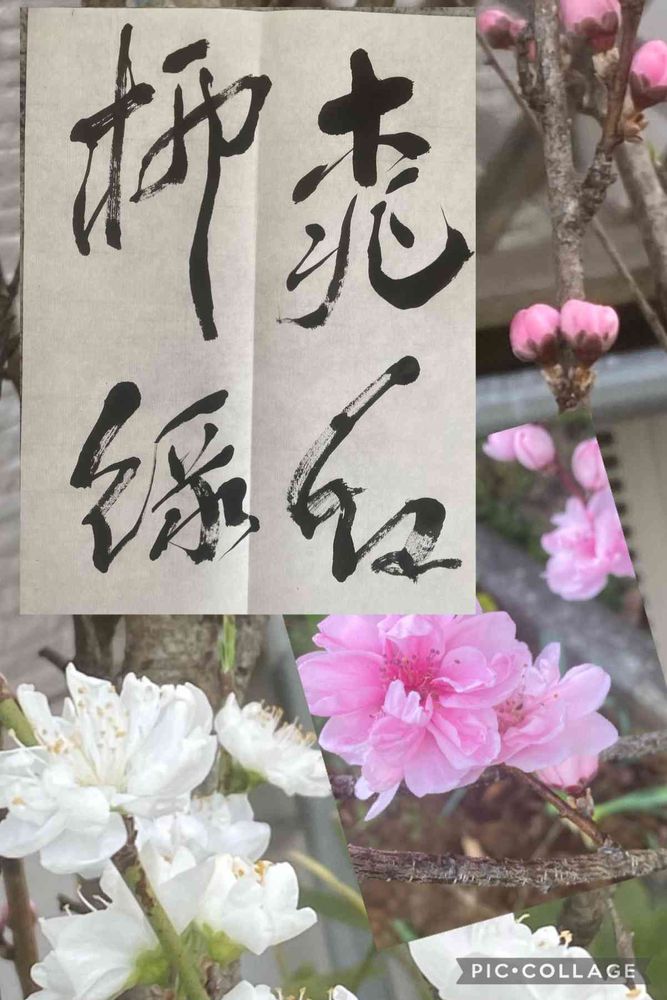 桃の美しい紅の花と、柳の鮮やかな緑の葉