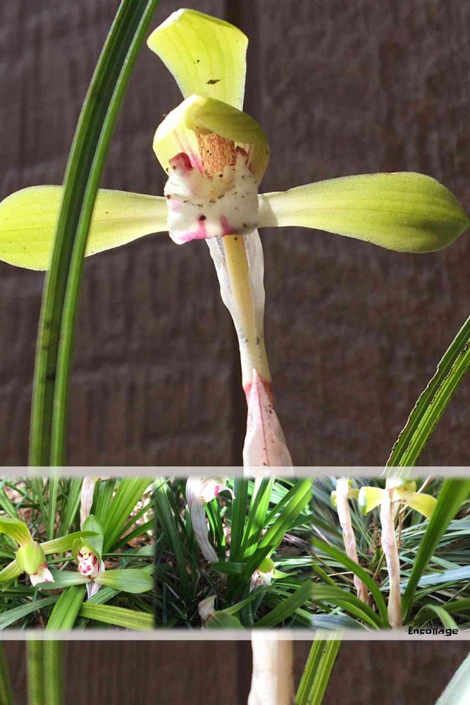 春蘭は半日影の白のクリローさんの横並びに植えています。