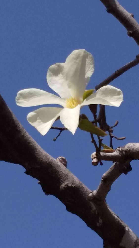 大きな木に白いお花が一輪咲いています。ハクモクレンのような花びらですが、AIさんご教示下さいませ。