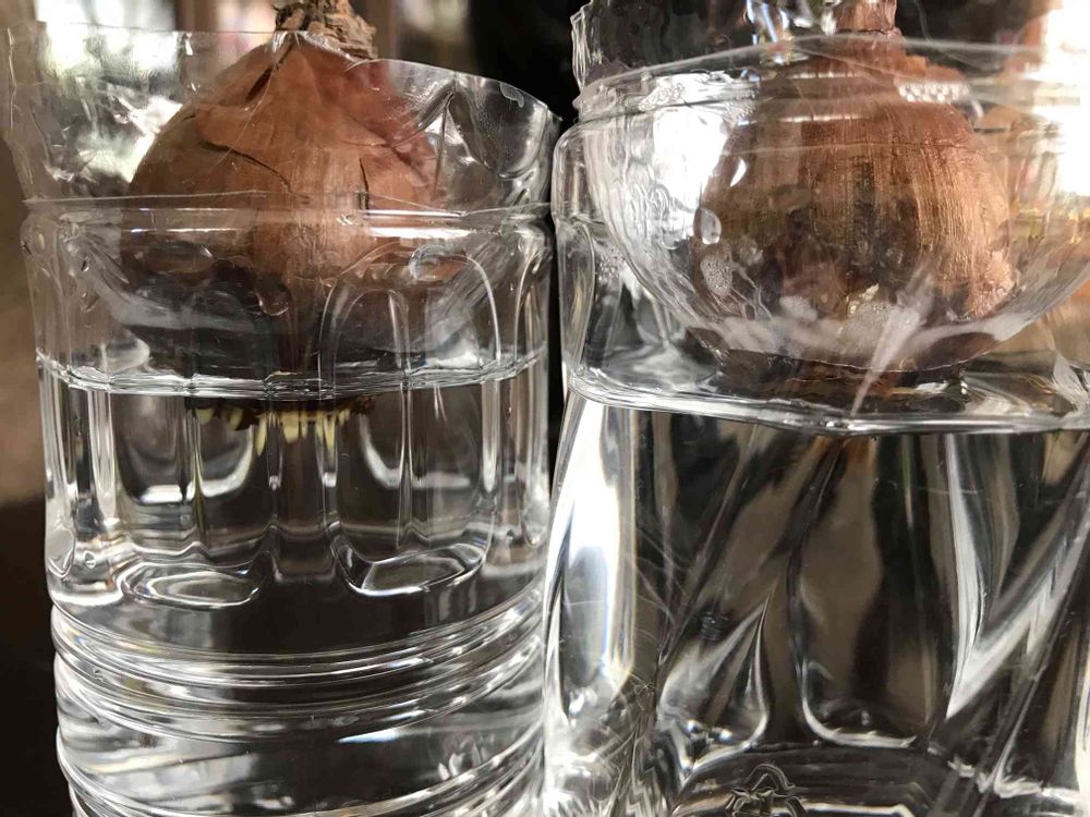 落ちていた球根を 頂戴してきたわけですが 水栽培用の容器は 買うのがもったいないので ペットボトルで作成しました