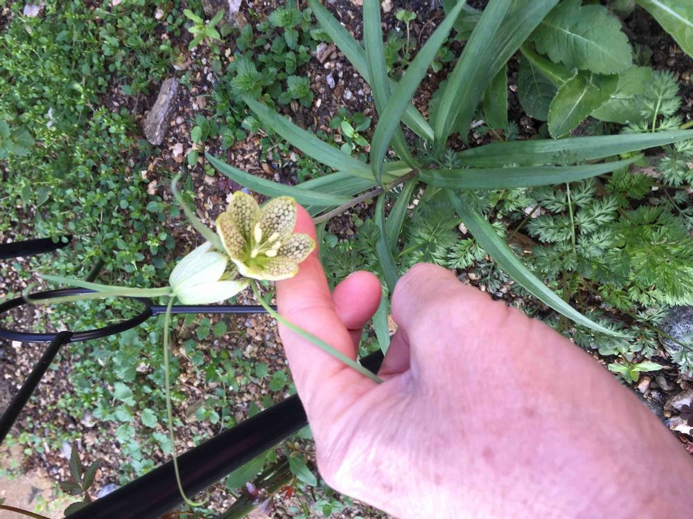 庭の土の上に咲いています。小さい百合みたいな感じ。下を向いている。持ち上げたら柄がある。何か教えてください。