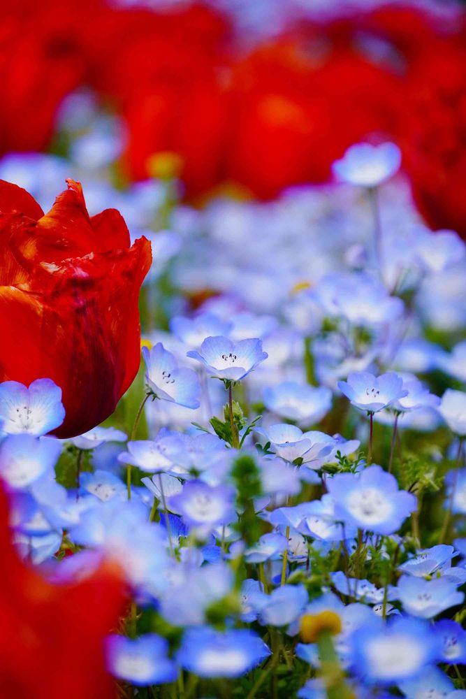公園花壇の、ネモフィラ🌼と、チューリップ🌷2色の花🌼を、まるりさんの十八番アングルで撮影する事で、素敵さ倍増やね🤗