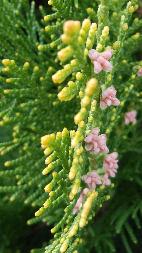 この手が皺、コノテガシワの花、よく見ますけど、いつも白い花だと思ってましたが、ピンクなんですね。😎