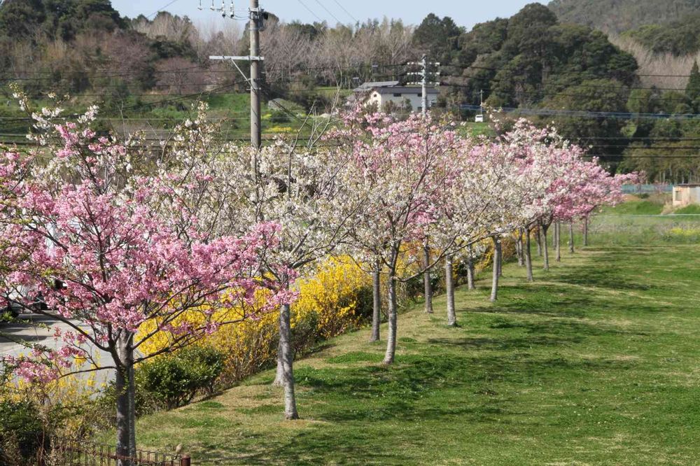 河津桜とソメイヨシノとレンギョウが咲いていました、素敵なコラボ☺️