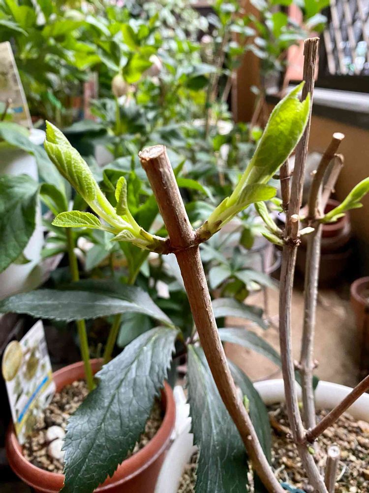 去年、苗木で購入して、咲くこともなく落葉したノリウツギが長いこと枯木状態で、他の紫陽花のように新芽が膨らんでいる様子もなく、、、これゃ!やっぱり⭐️になった💧と思っていたところ〜あちこちから、ぷっくりしたものがぁ🌿🥺