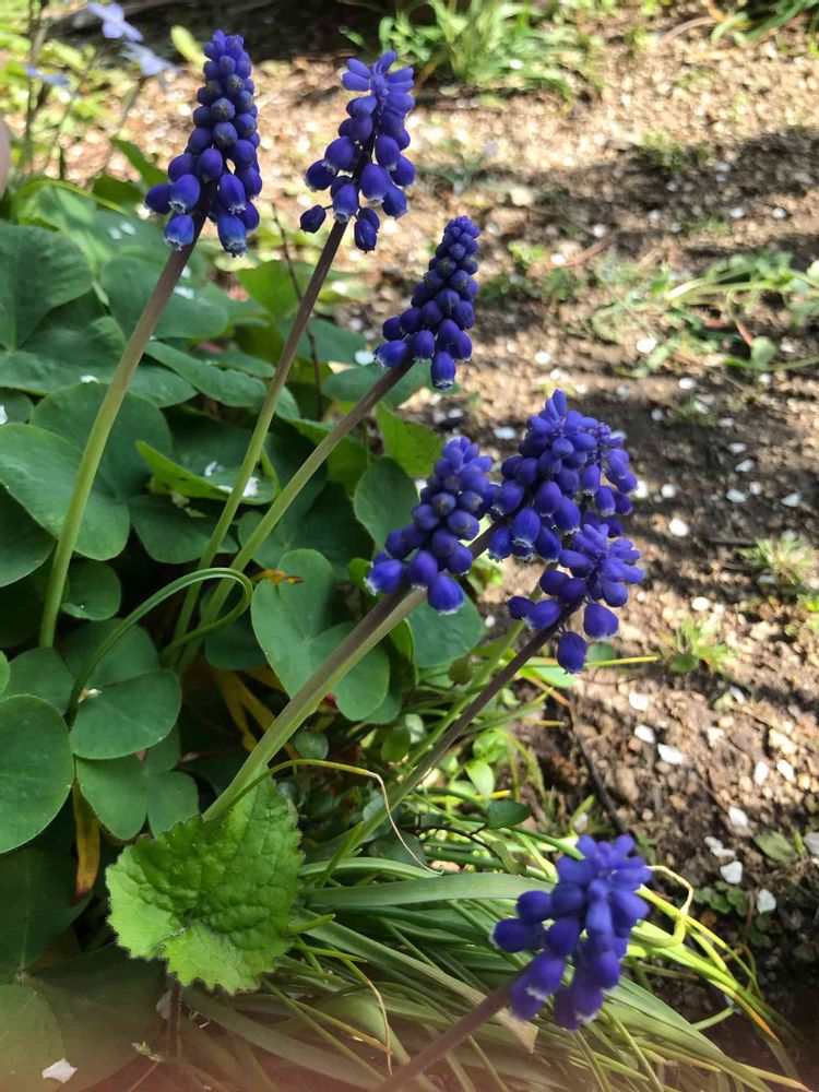 ムスカリがオキザリスの葉をかき分けて自己主張して咲いてます😂💜💙💜