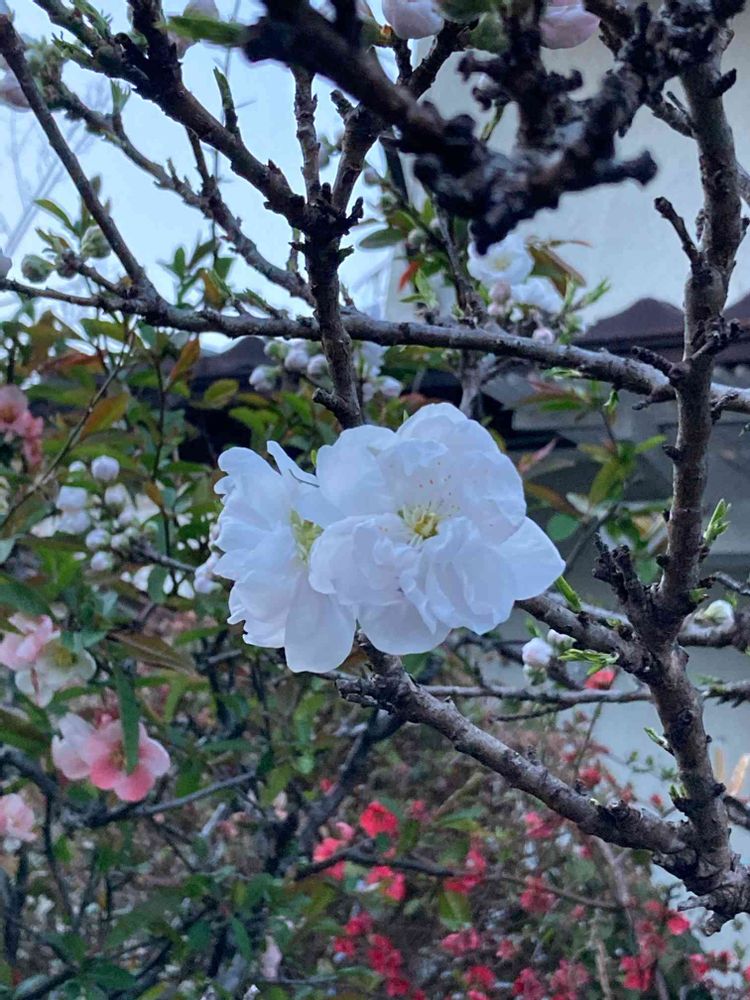 午後6時過ぎです。白い木瓜がひっそりと咲いている感じです。