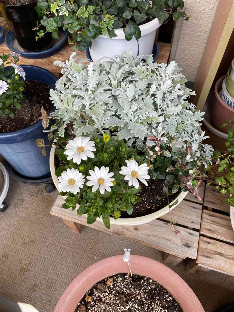 こちらのオスティオスペルマム、二回もしなだれてしまったので、葉牡丹植えてた所に植え替え