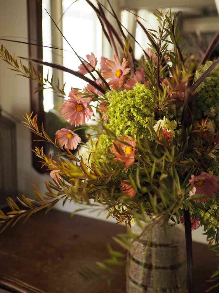 コスモスとアナベルのブーケシャンペトル。レッドフォックスと紅葉した雪柳にも秋を感じます。